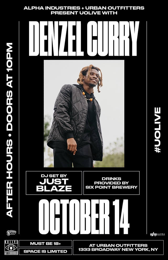 10/14/16- @AlphaIndustries x @UrbanOutfitters prsnts #OULIVE w @DenzelCurry + @JustBlaze w @SixPoint #freebooze #openbar #freeshow FREE ENTRY
